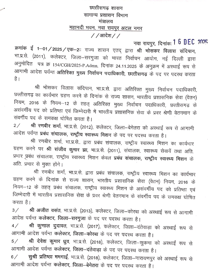 CG ब्रेकिंग-IAS ट्रांसफर: अंबिकापुर, कोरबा, दंतेवाड़ा समेत कई जिलों के कलेक्टर बदले, 11 आईएएस के तबादले